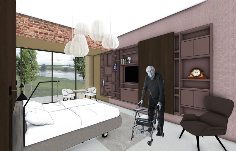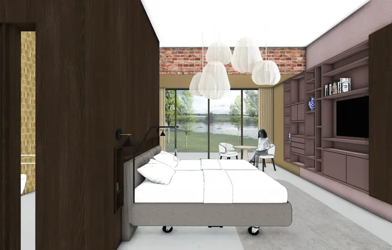 Om tot een kloppend hospiceontwerp te komen, onderzocht ik vier essentiële lagen: de context (met aandacht voor de geschiedenis van de plek, de verbinding met Deventer en de omliggende natuur); de gebruiker (bewoners, familieleden en zorgmedewerkers, ieder met unieke behoeften); de zorgomgeving (waarin rust, comfort en waardigheid de ruimte bepalen); en het gebouw zelf (wat het bestaande pand toelaat en hoe je dat transformeert tot een warme, menselijke plek). Elk onderdeel van het interieurontwerp voor hospices is gebaseerd op deze inzichten: van multifunctionele afscheidsruimtes en logische routes tot intieme familieplekken en een zachte overgang tussen binnen en buiten.